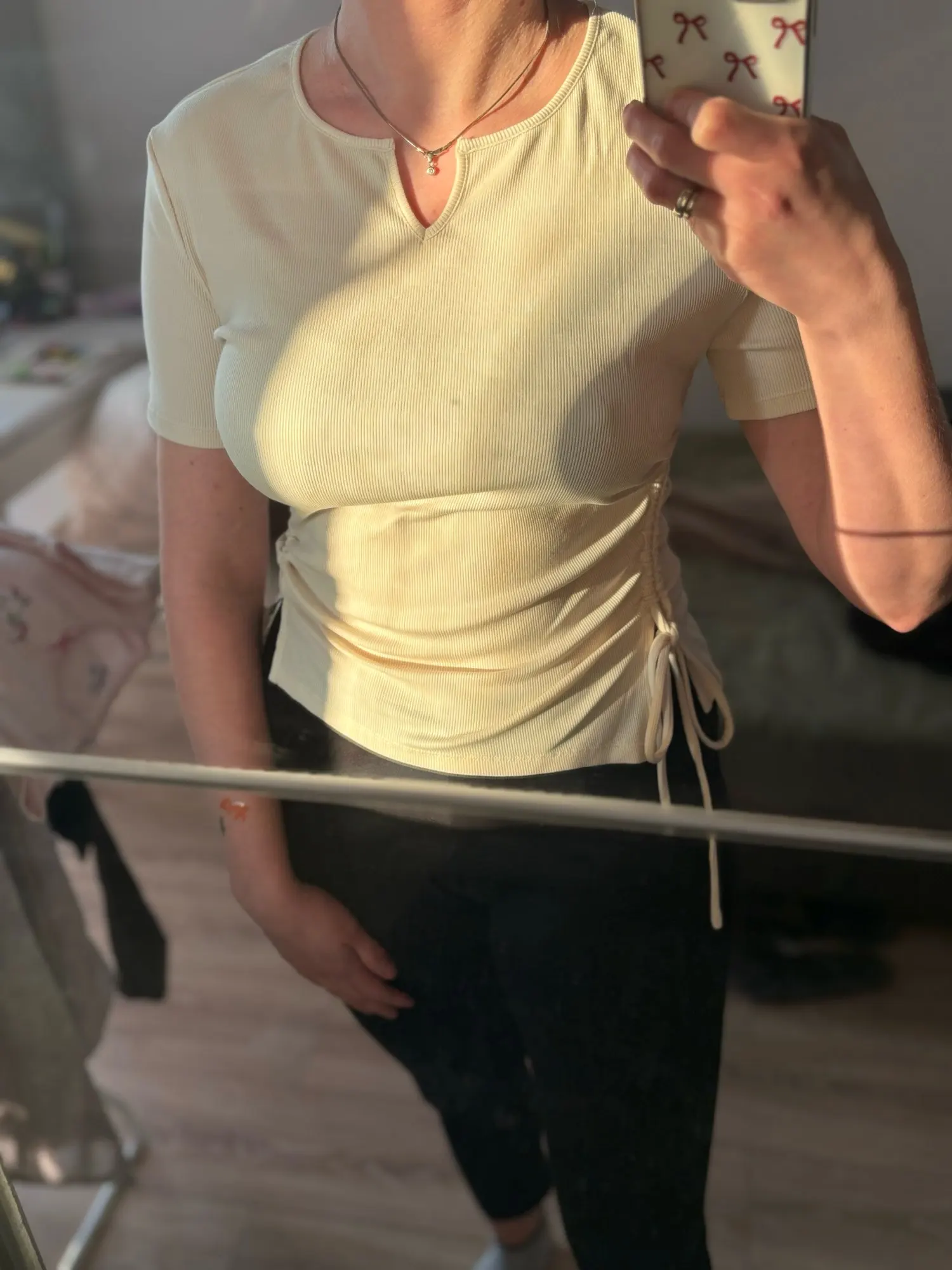 A flattering knit tee with feminine flair. Featuring subtle ruching and adjustable drawstrings on both sides, this V-neck top hugs the waist just right. Crafted in soft blended fabric with a slight stretch, it’s your summer go-to for an effortlessly shaped look.